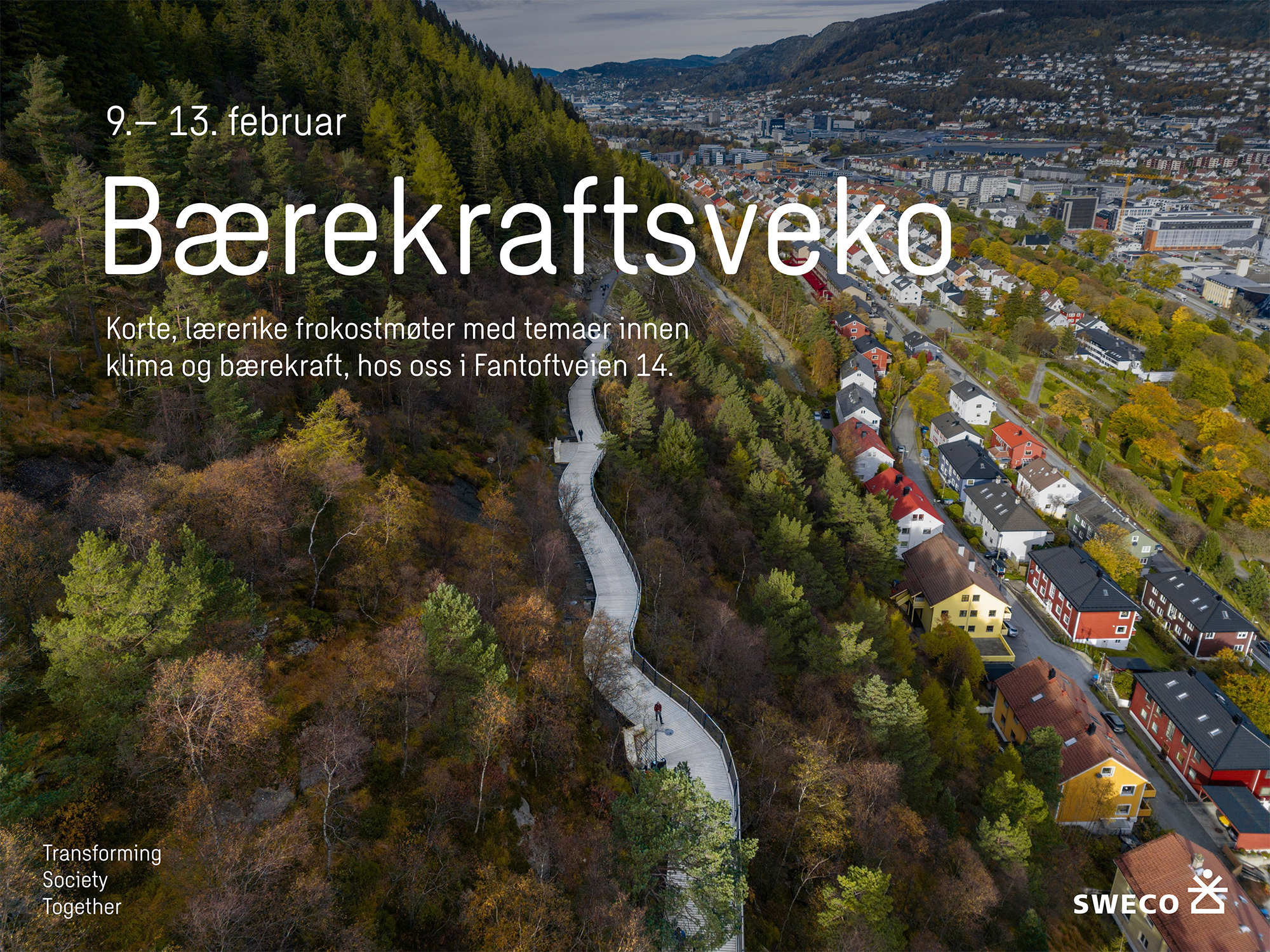 I Sweco jobber vi sammen med våre kunder med å bygge fremtidens byer og samfunn, og bærekraft står sentralt i våre prosjekter. Derfor arrangerer Sweco Bergen Bærekraftsveko – en møteplass for alle som ønsker å lære mer om, og samarbeide om klima og bærekraft.