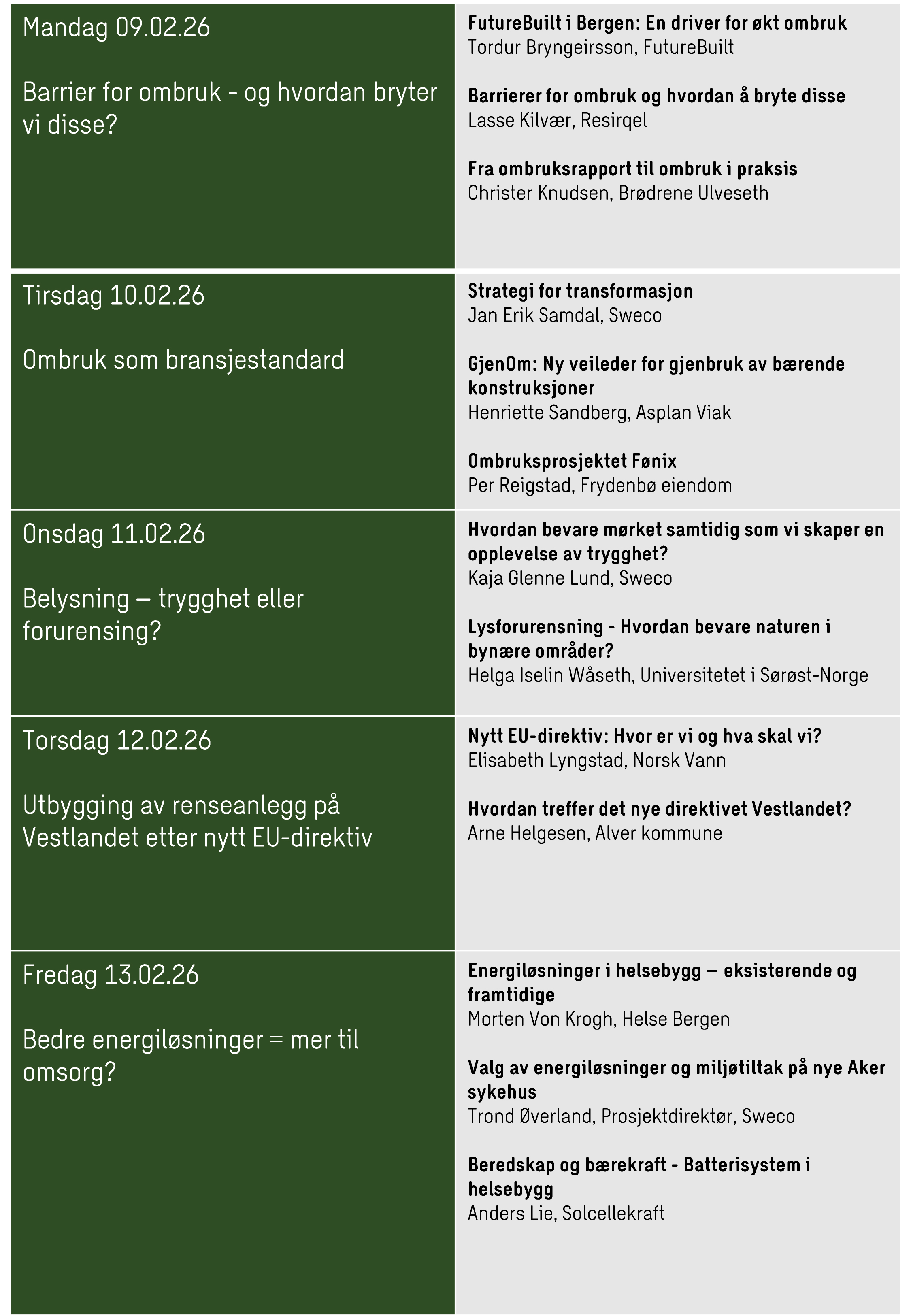 Den 9. til 13. februar arrangerer vi frokostmøter på kontoret vårt i Bergen. Det blir ulike temaer hver dag, men fellesnevneren for alle presentasjonene vil være bærekraft.