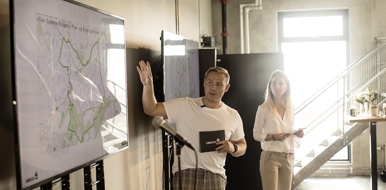 Vi har høye ambisjoner. Ikke bare skal studentene finne svar på komplekse spørsmål innen byutvikling, de skal også formidle prosjektet på store scener. Selvfølgelig får de masse støtte og veiledning, blant annet fra et eksternt panel, men også fra fageksperter innen byutvikling, ingeniørfag og kommunikasjon fra Sweco.