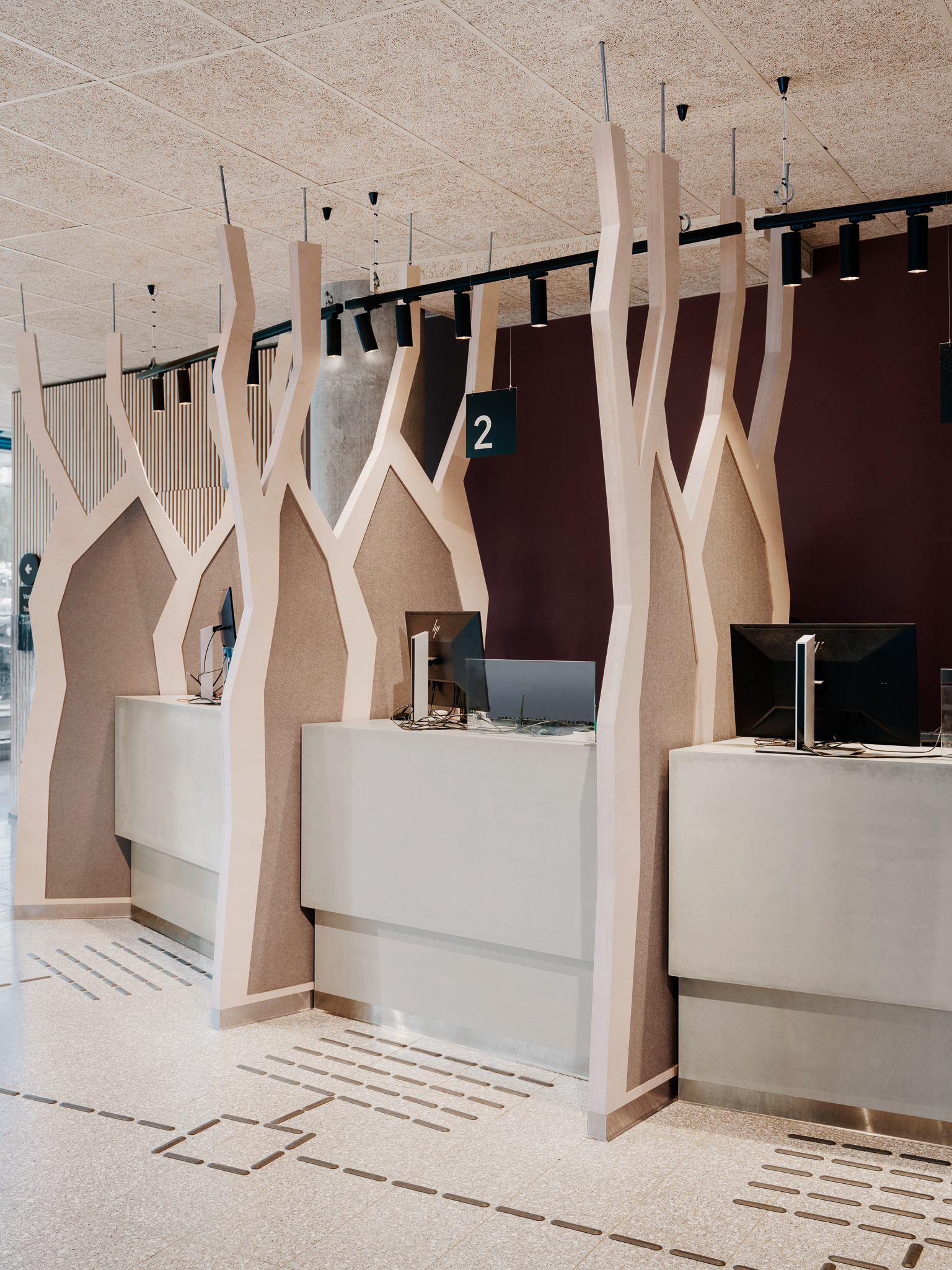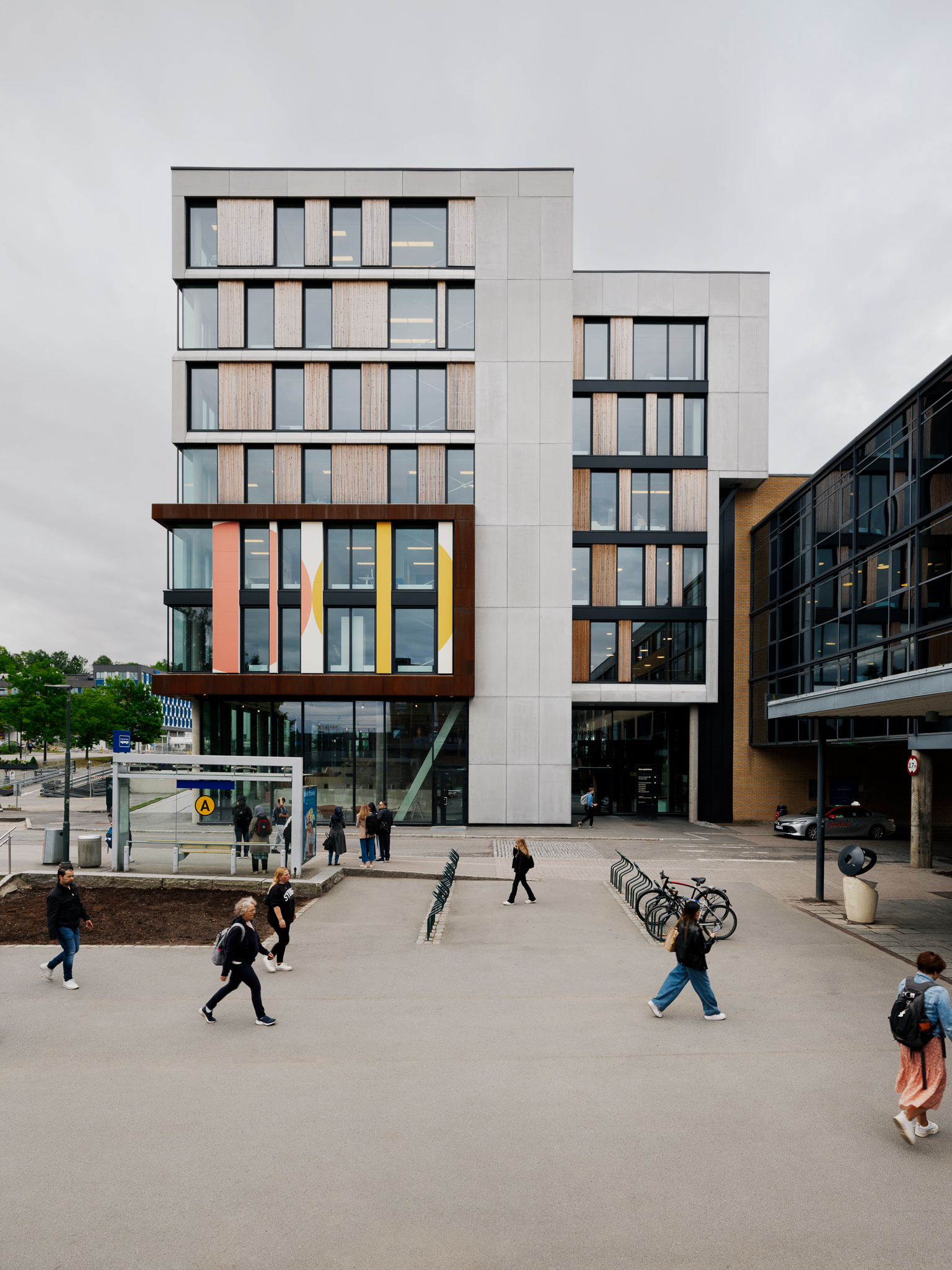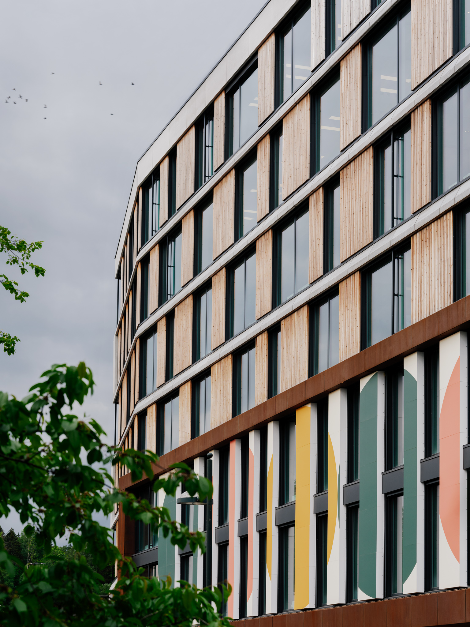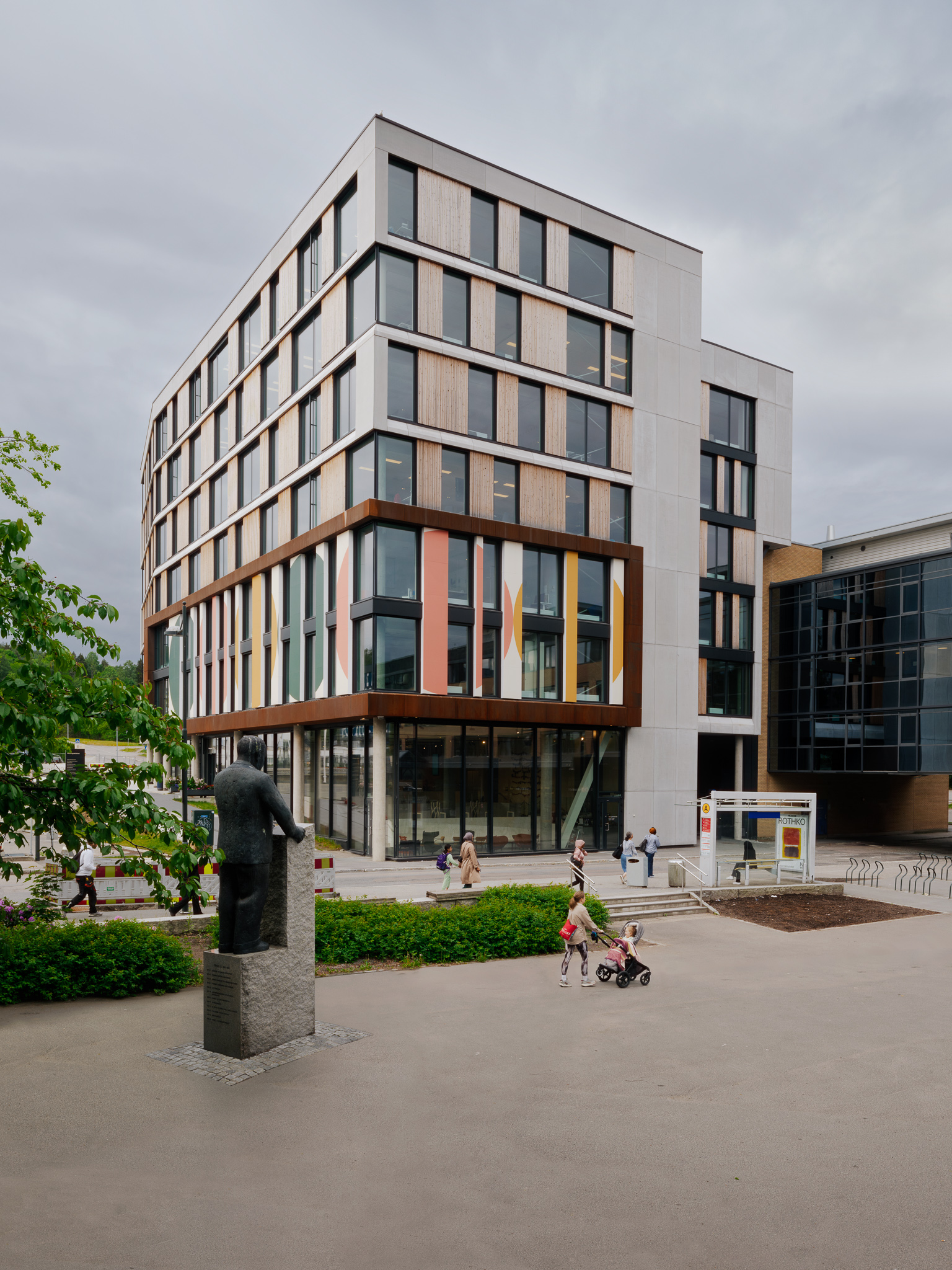 Bygget har en gjennomgående fargepalett som gjenspeiler områdets kulturelle mangfold, og materialene er valgt for å tåle vær og tid.