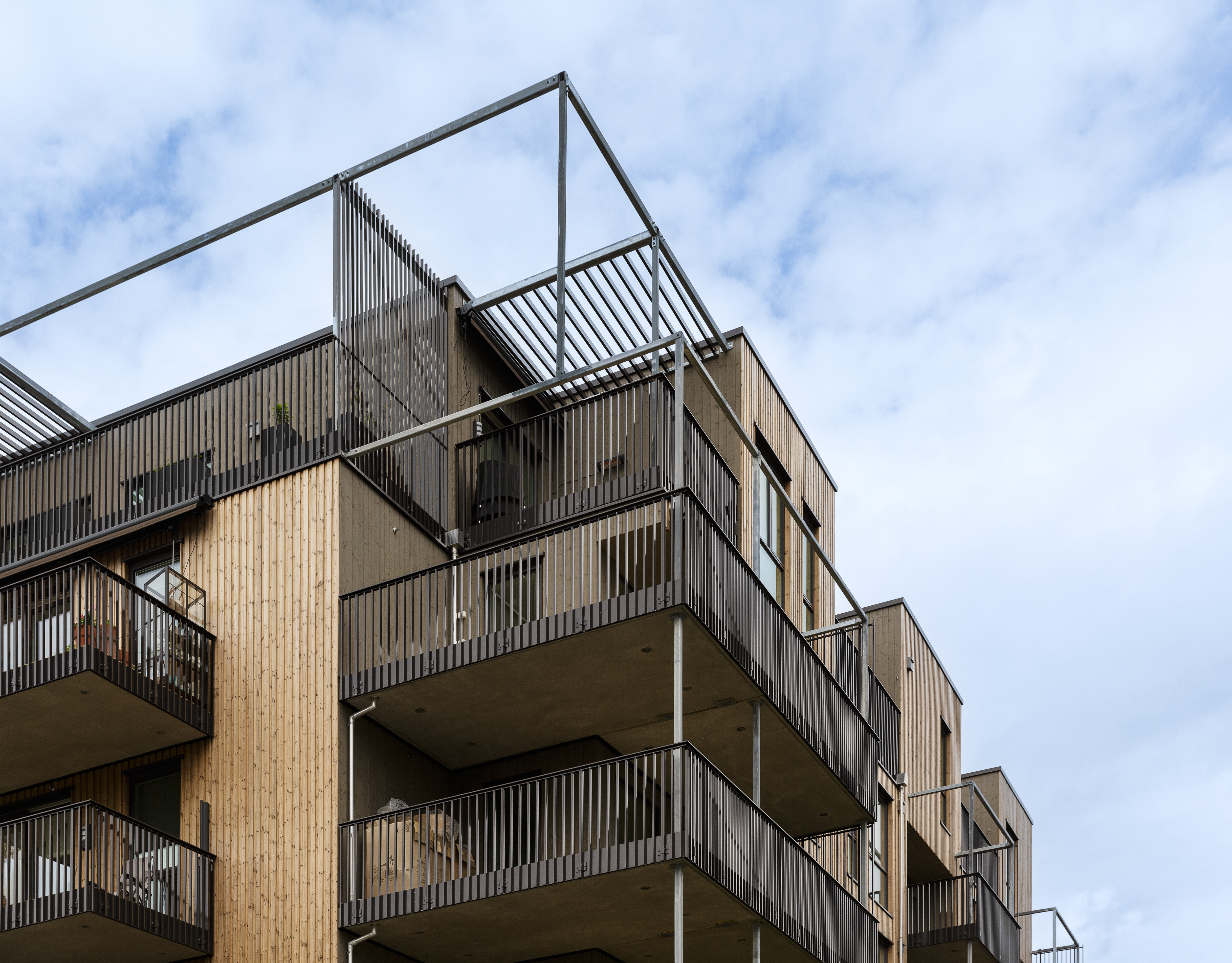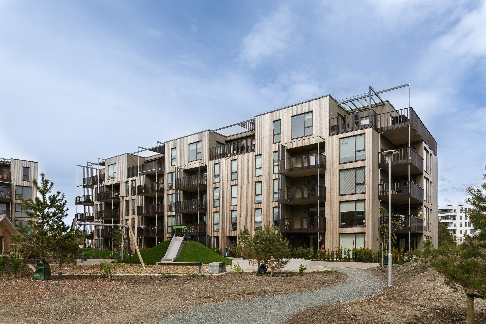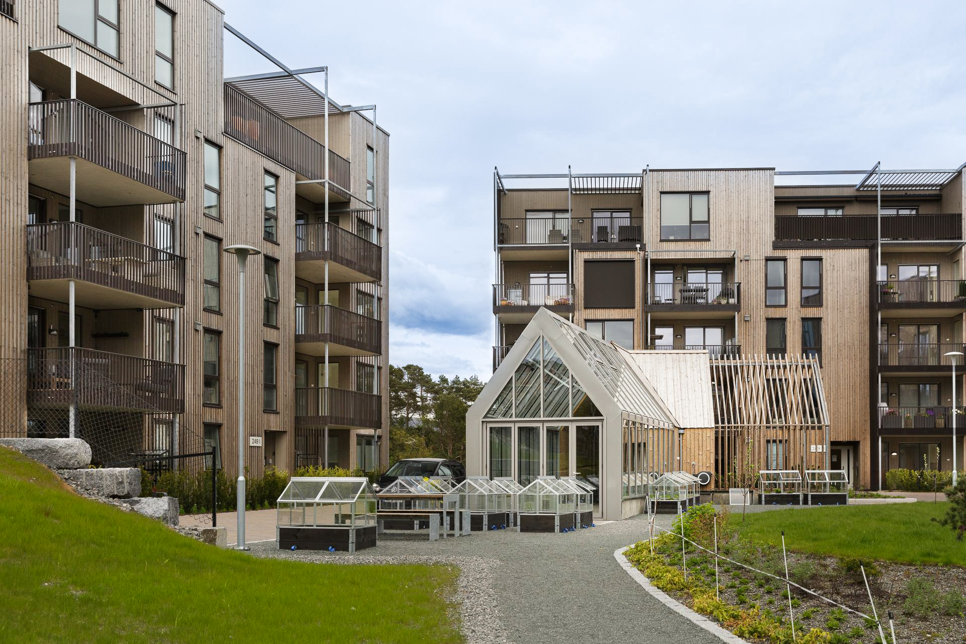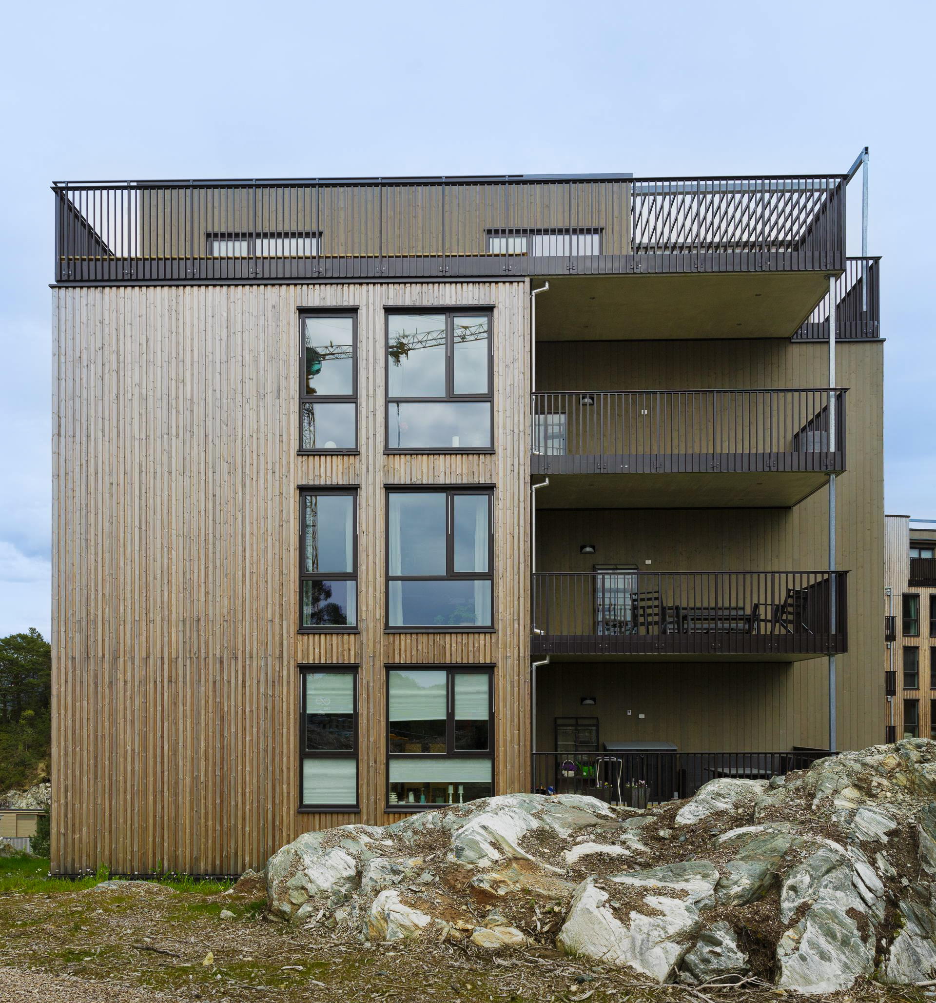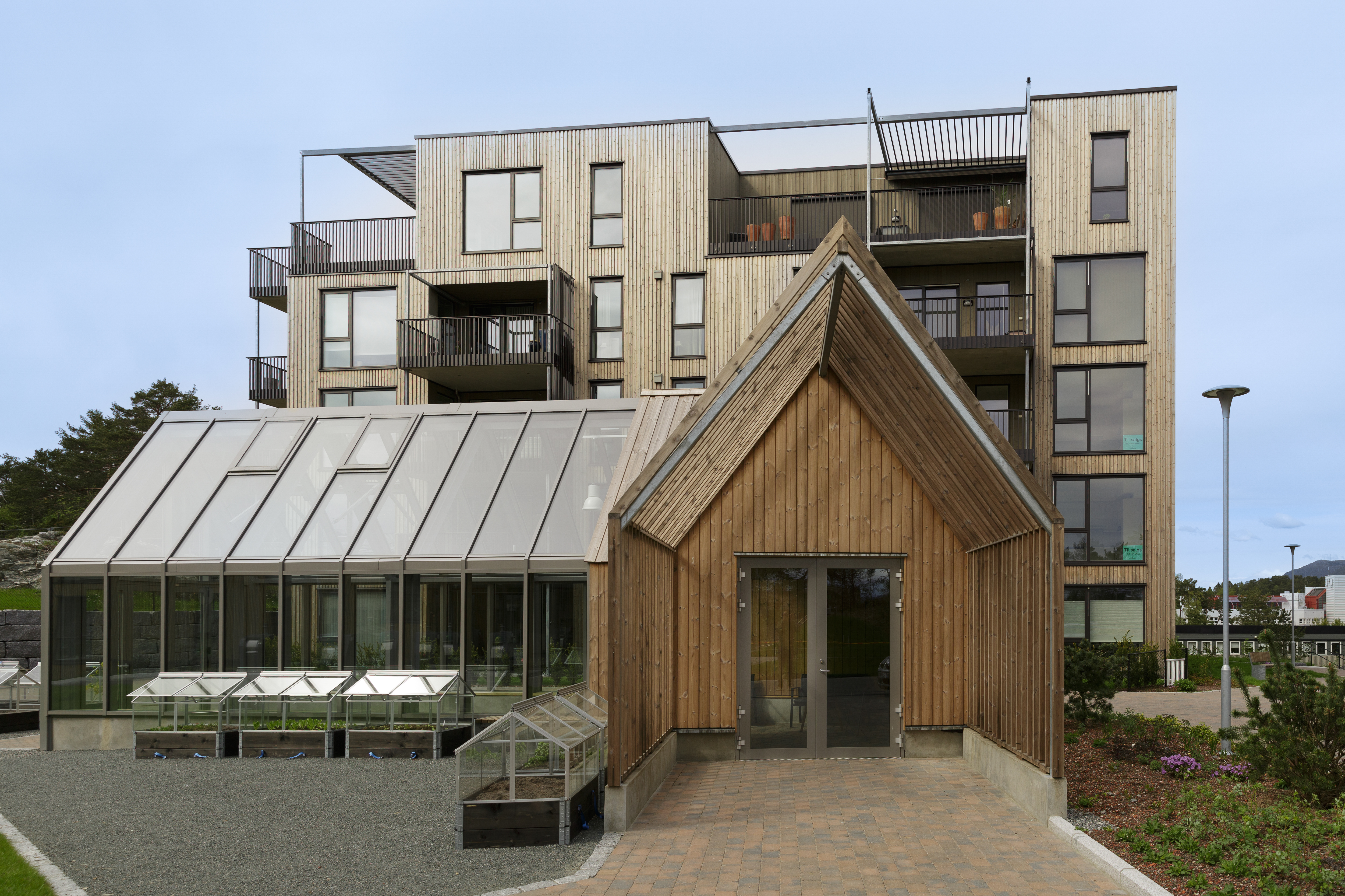Tre er valgt som fasademateriale, og det er lagt stor vekt på å skape et variert fasadeuttrykk som spiller på vertikaliteten i trærne på tomten. I Gartnerlien har vi prosjektert store leiligheter der man kan bo lenge og gjennom flere stadier i livet. Dette gir mulighet for at unge kan etablere seg, småbarnsfamilier har nok rom og eldre kan ha barnebarna på overnatting. Vi tror dette prosjektet gir plass for alle aldersgrupper. For å dempe fjernvirkningene og det visuelle uttrykket er fasadene kledt med naturmaterialer i avdempede farger som harmonerer med vegetasjon og landskapstrekk i området.