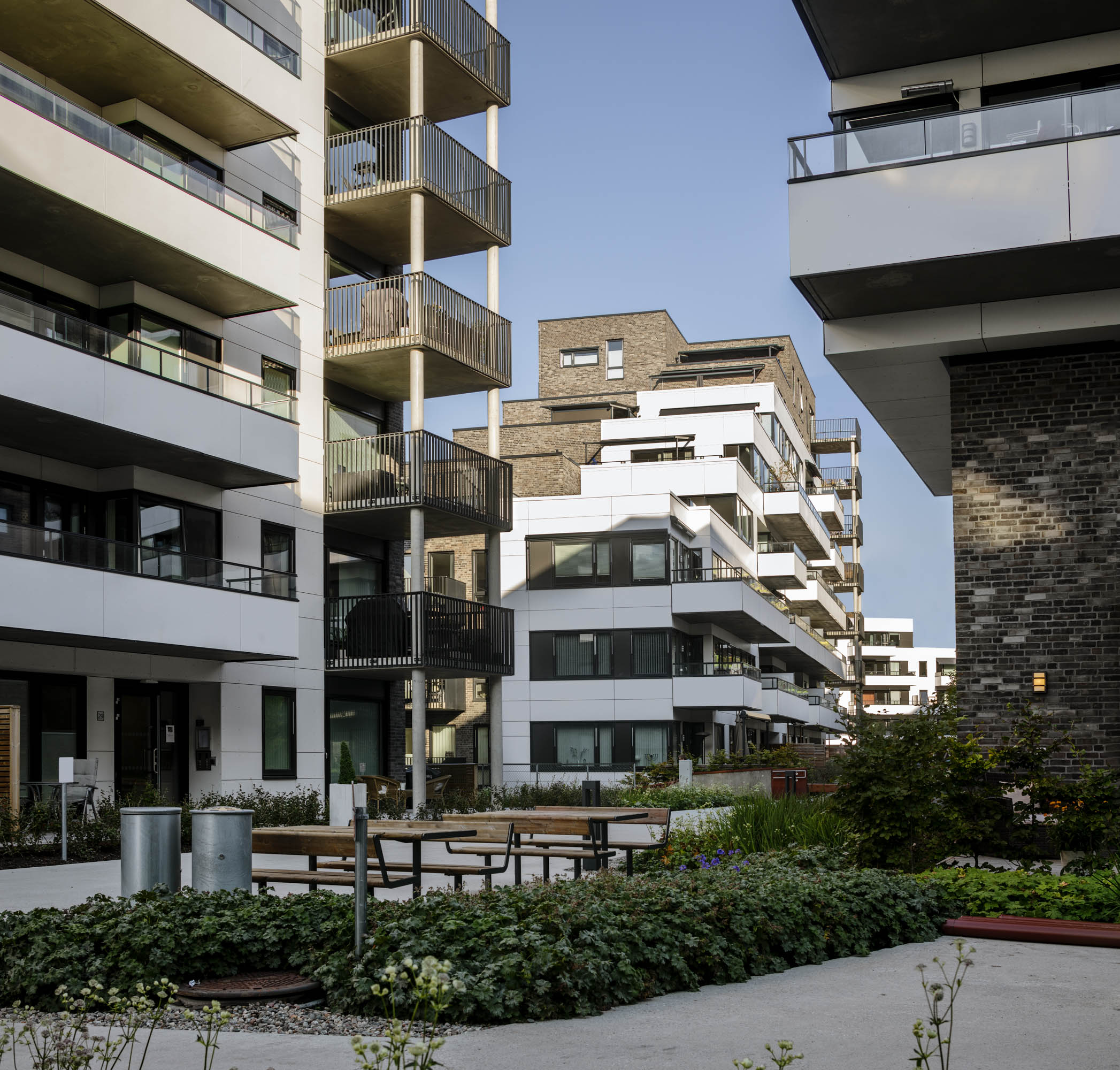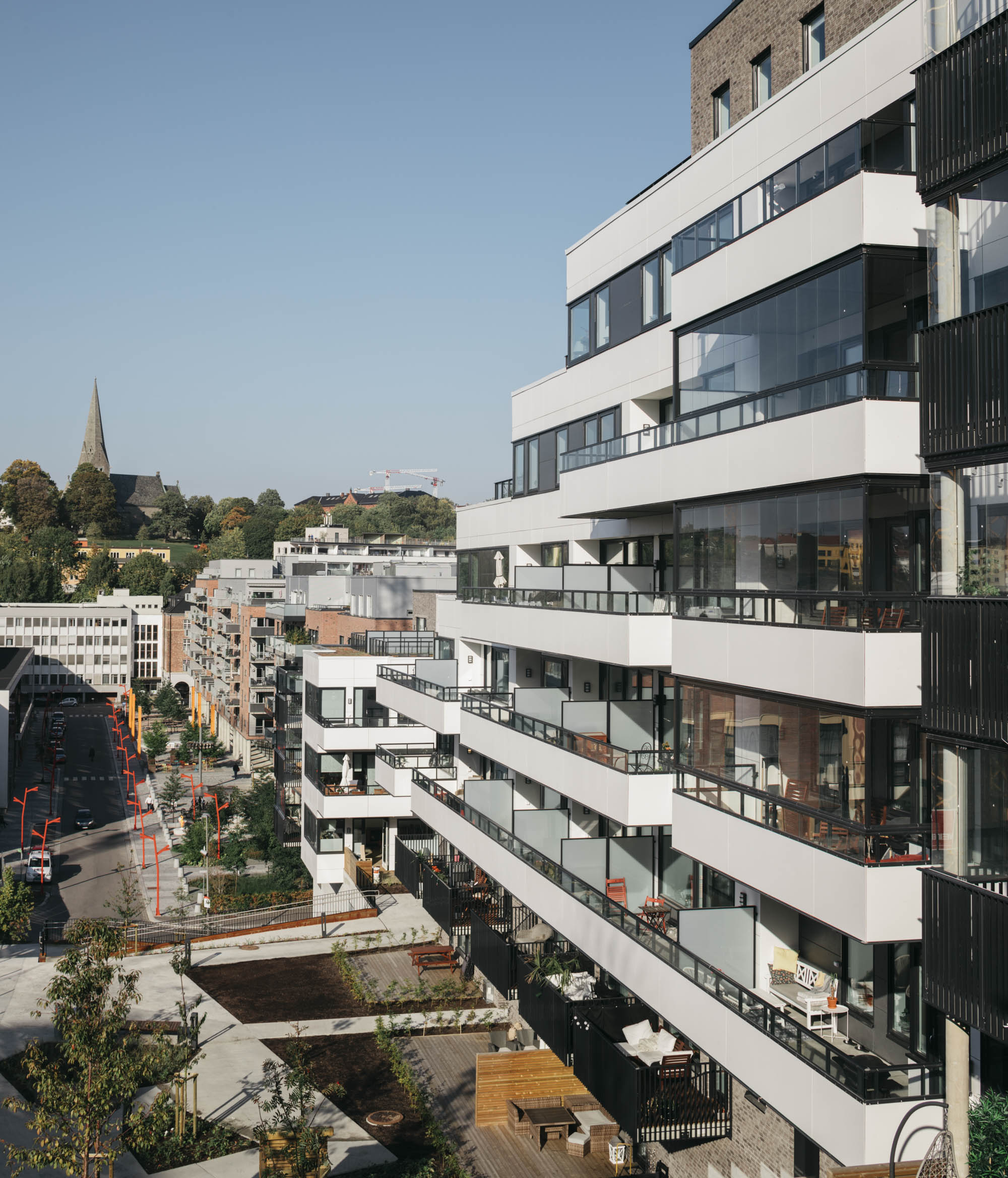 Balkongene på den lyse siden er integrert i bygningsvolumet i form av hvite «bånd» av sementplater, mens på den mørke siden er det skapt større kontrast i materialer med blanke, hvite punktbalkonger mot den mørke teglsteinen. Detaljering og presisjon er vektlagt i gjennomføringsfasen, med fokus på at linjer skal være gjennomgående i fasadelivet. Sedumtaket preger alle tak og takterrasser. Fordelene er mange med sedumtak; sedum renser og avkjøler luften over taket, det gir naturlig fordrøyning av regnvann, øker biologisk mangfold og gir nye leveområder for bier og insekter. Takene preger området rundt og følger årstidene med varierende farger og uttrykk.