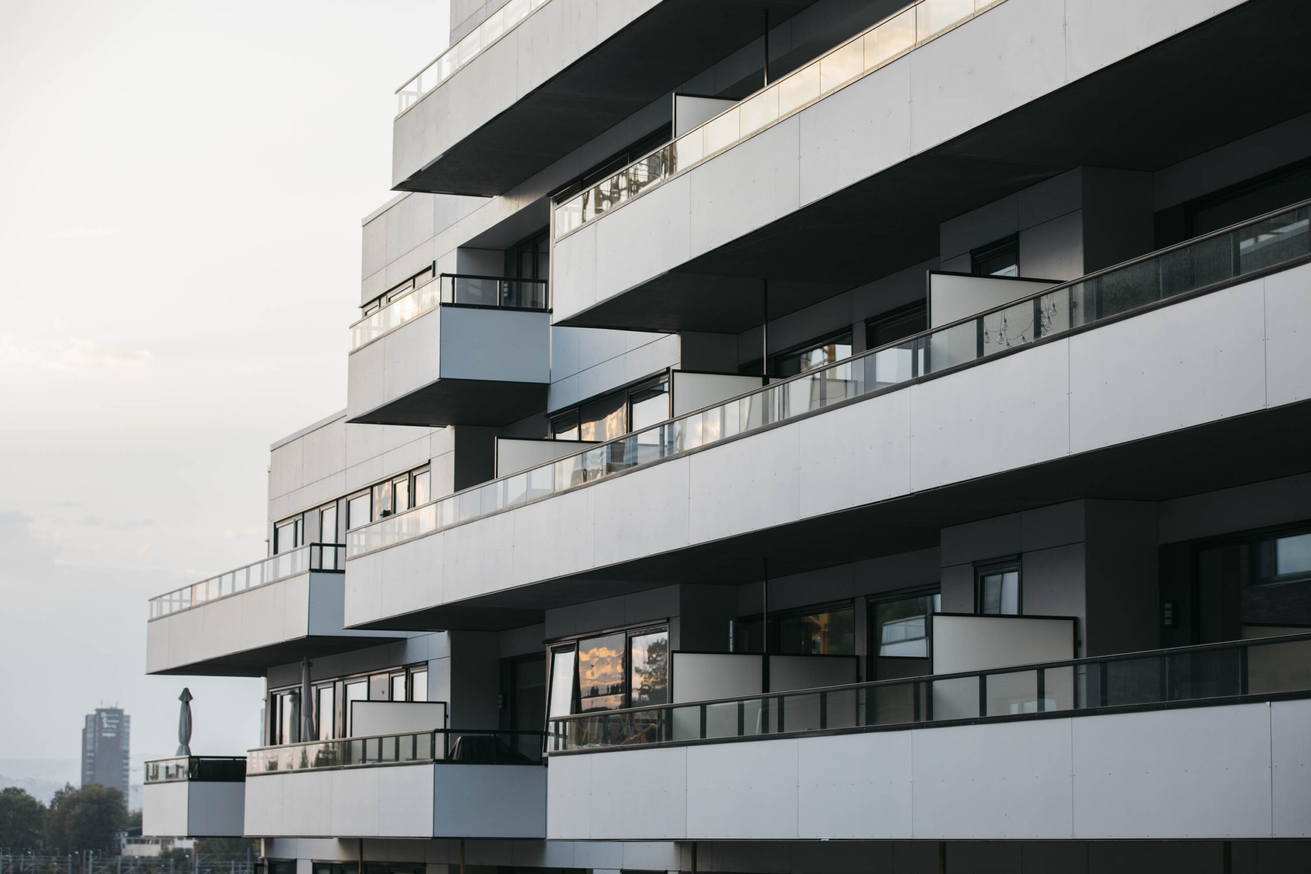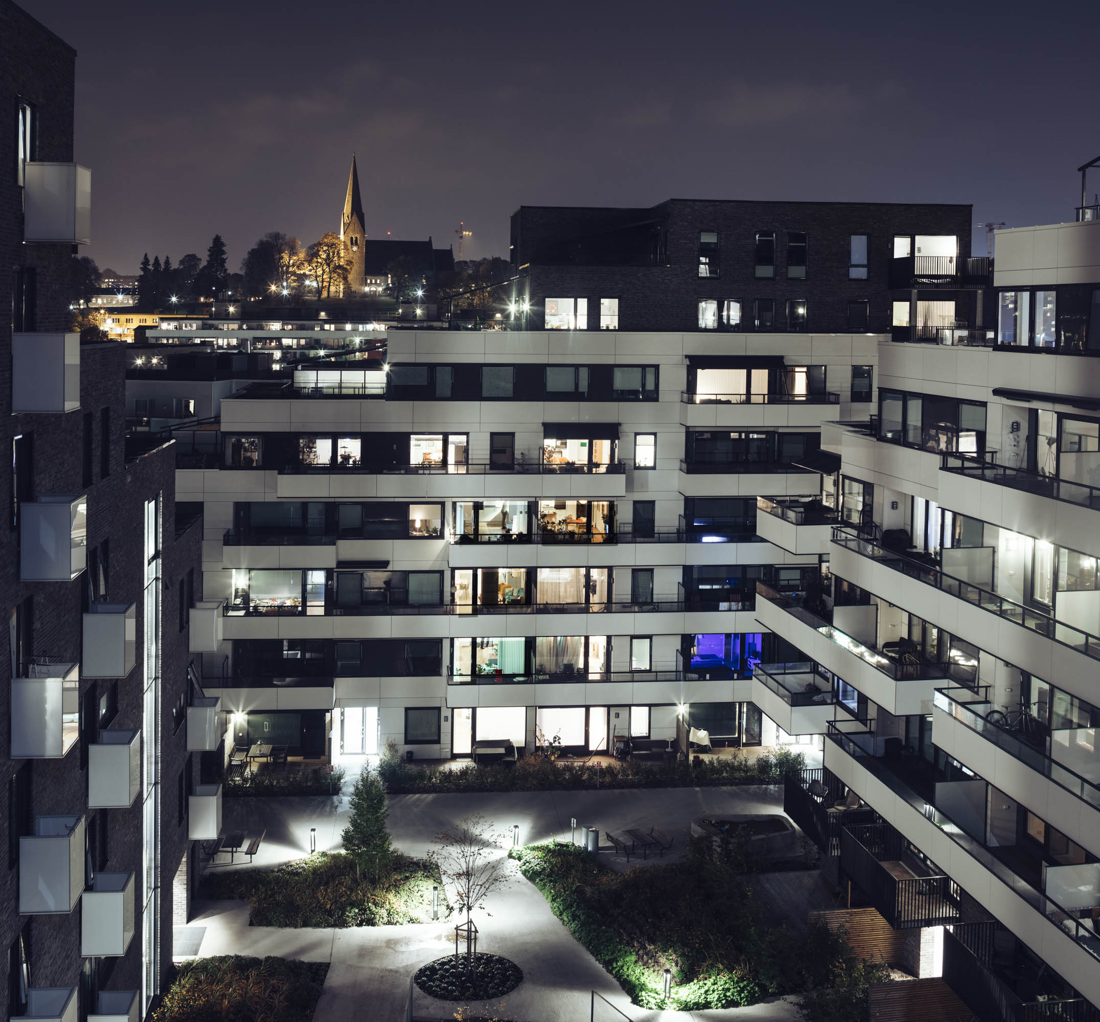 Boligvolumene trappes ned fra 10/8 til 5/4 etasjer. Volumene er formet som en høy, mørk rygg med en lavere, lys horisontalpreget forside. Det lyse volumet med lange, sideforskyvede, horisontale balkongbånd og vindusfelt, følger fasadene og bretter seg rundt den mørke siden. Dette skaper dynamiske kontraster i både volum og farger og skyggespill i fasadene.