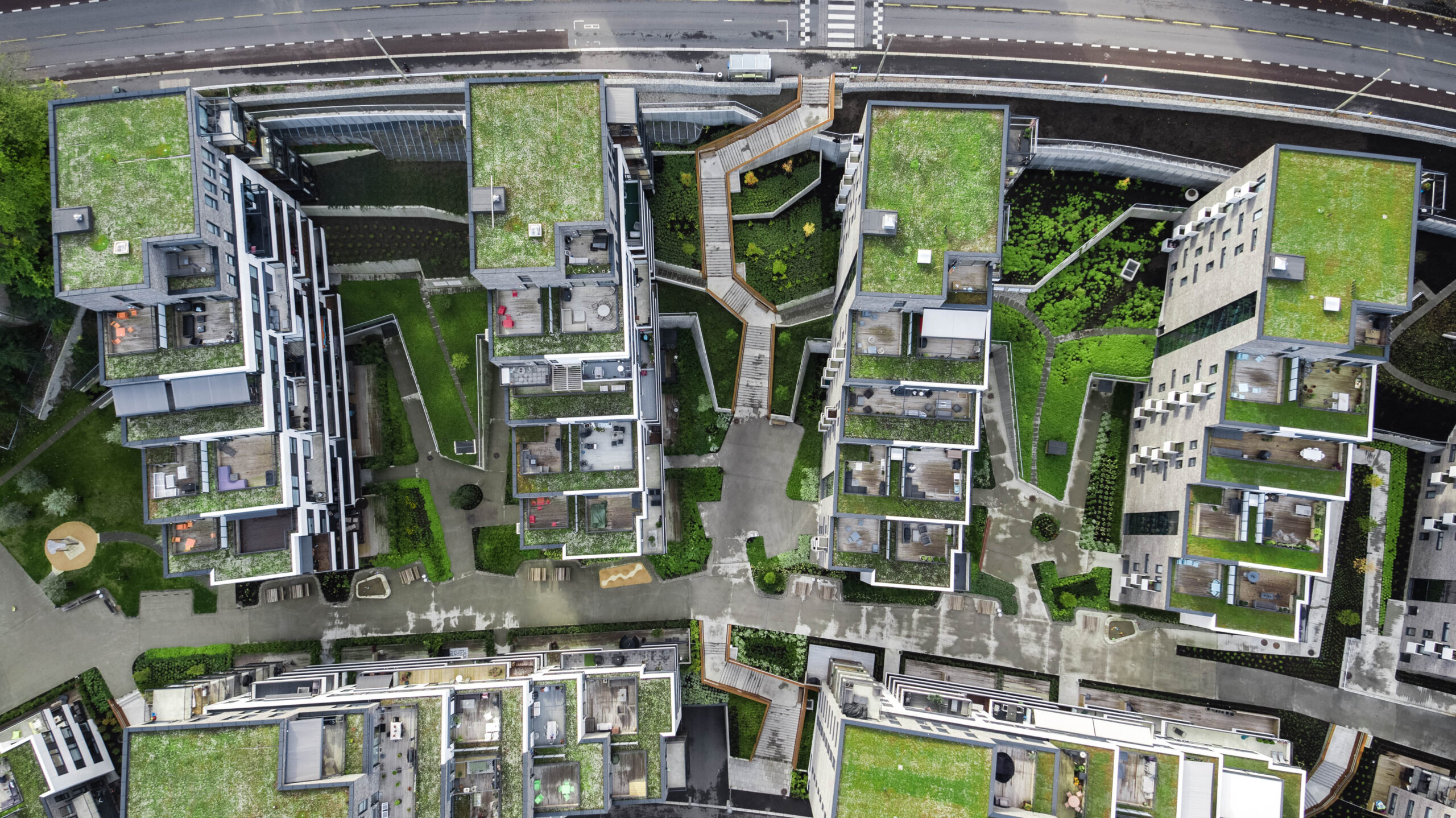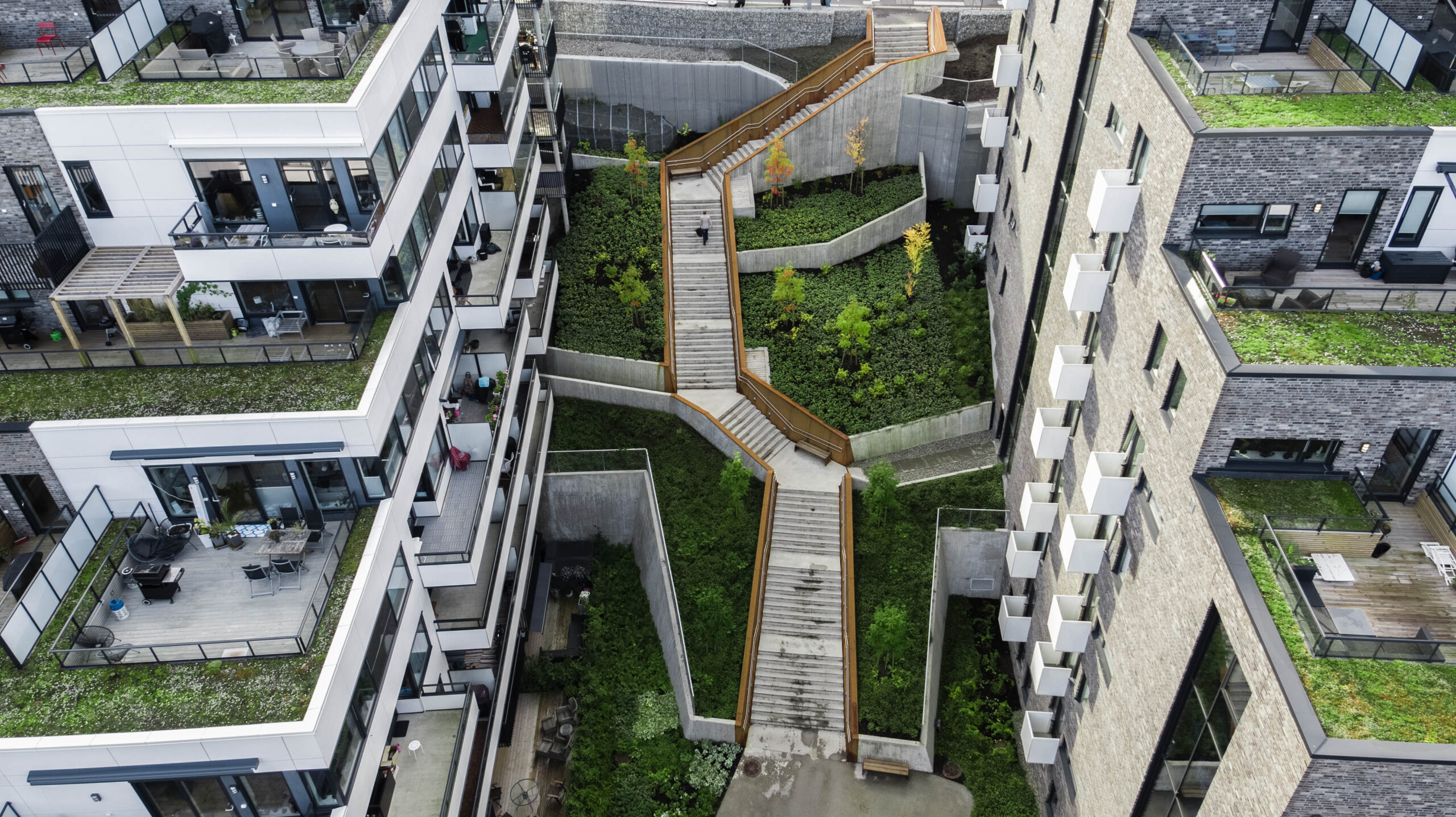 Ved å bebygge den bratte skråningen med terrassert bebyggelse, oppnås store takterrasser med gode solforhold. Terrasser beplantes med sedumtak, slik at man etablerer et grønt taklandskap. Alle boligene vil få inngang fra kvartalets indre rom.