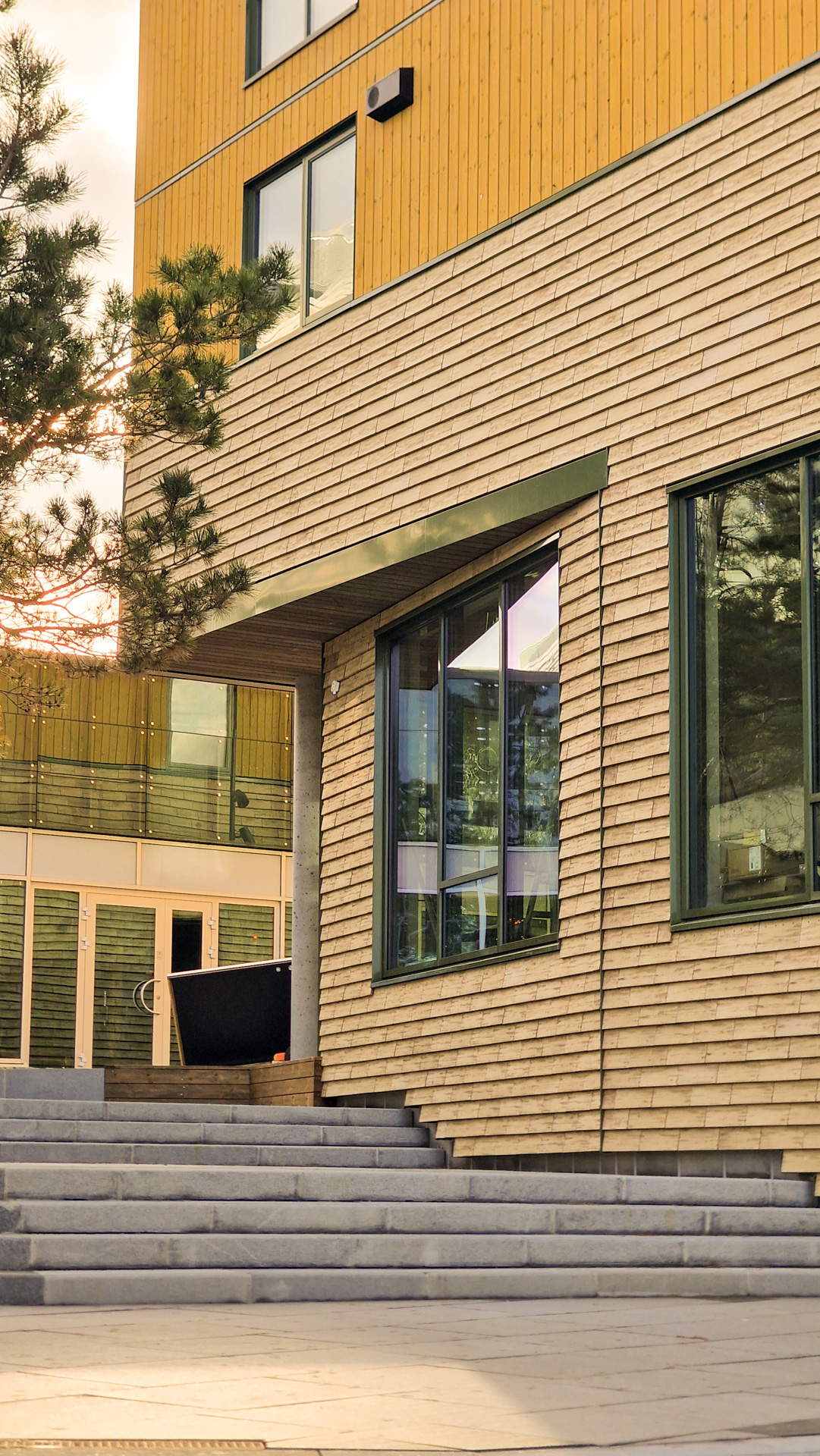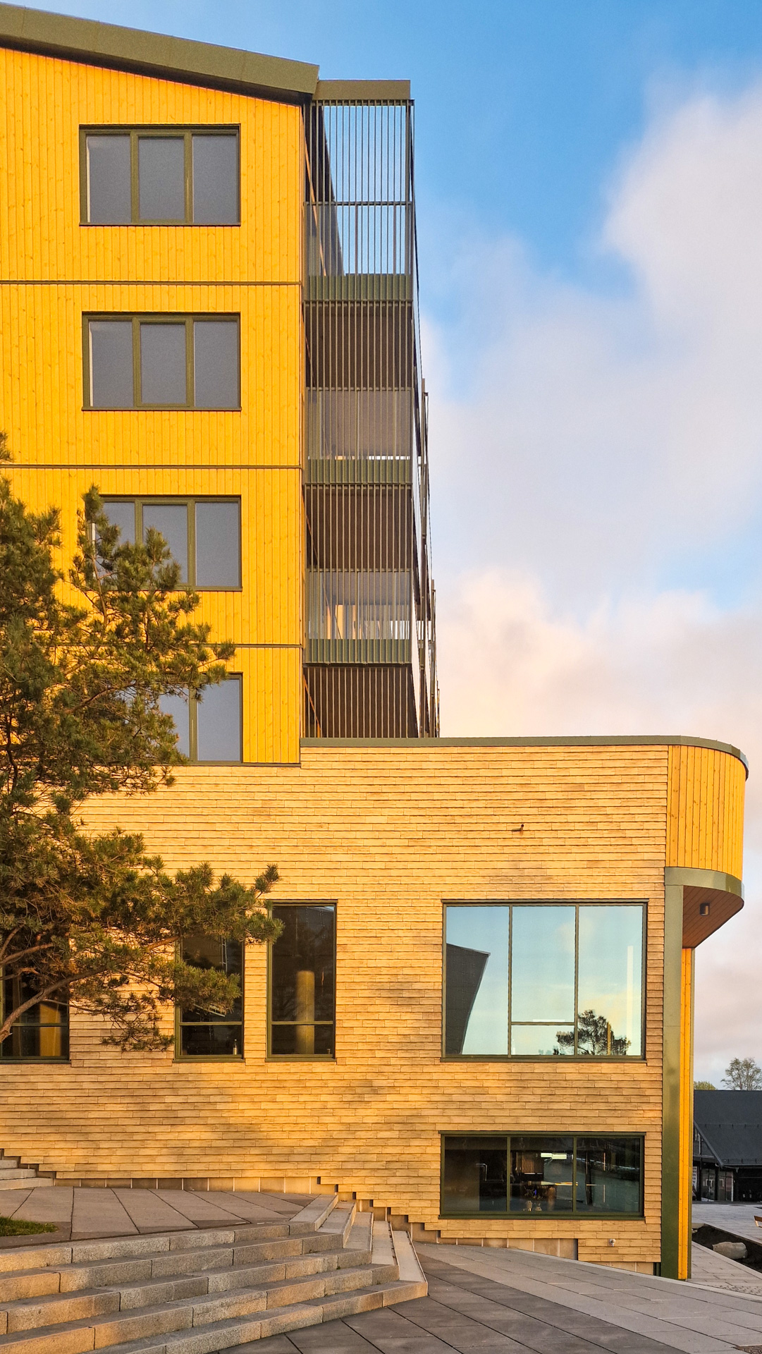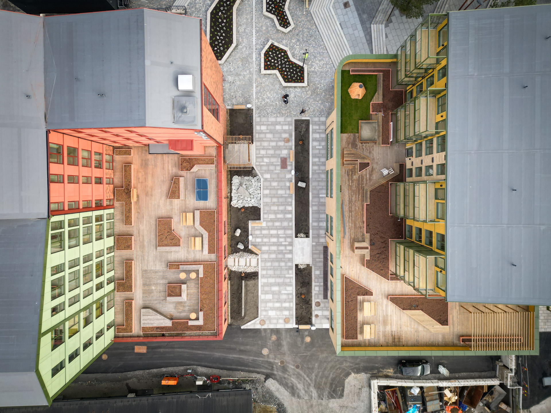Arkitekturen er formet av ønsket om å tilføre området varme, farge og dybde. Tegl i bakkeplan gir en taktil og urban karakter, mens fasadene over er komponert med komplementære farger og varierende dybder. Bygg S3 har rød bekledningstegl og Swisspearl-plater i røde og grønne nyanser, mens Bygg S4 kombinerer gule keramiske fliser med gult trepanel. Glassfasader åpner byggenes nederste plan mot byen.