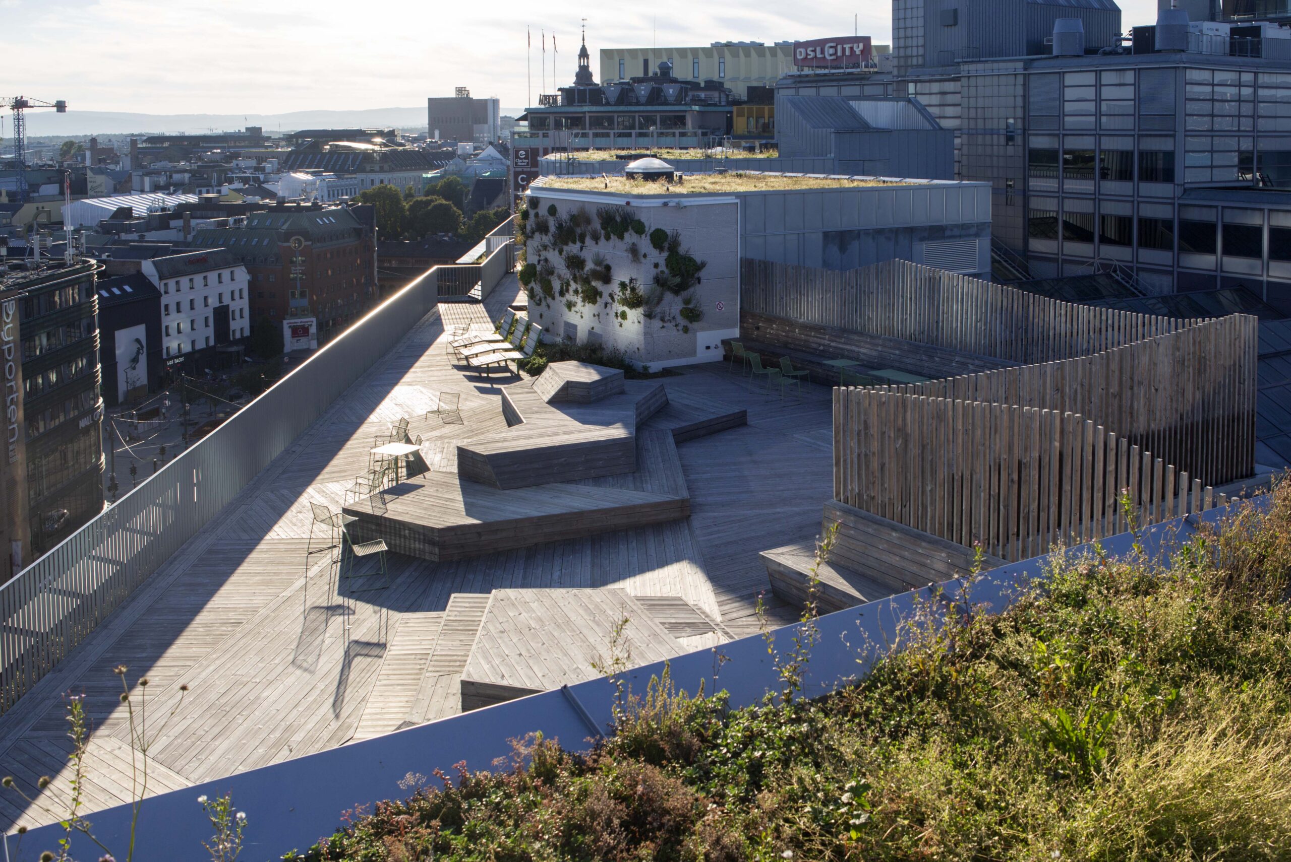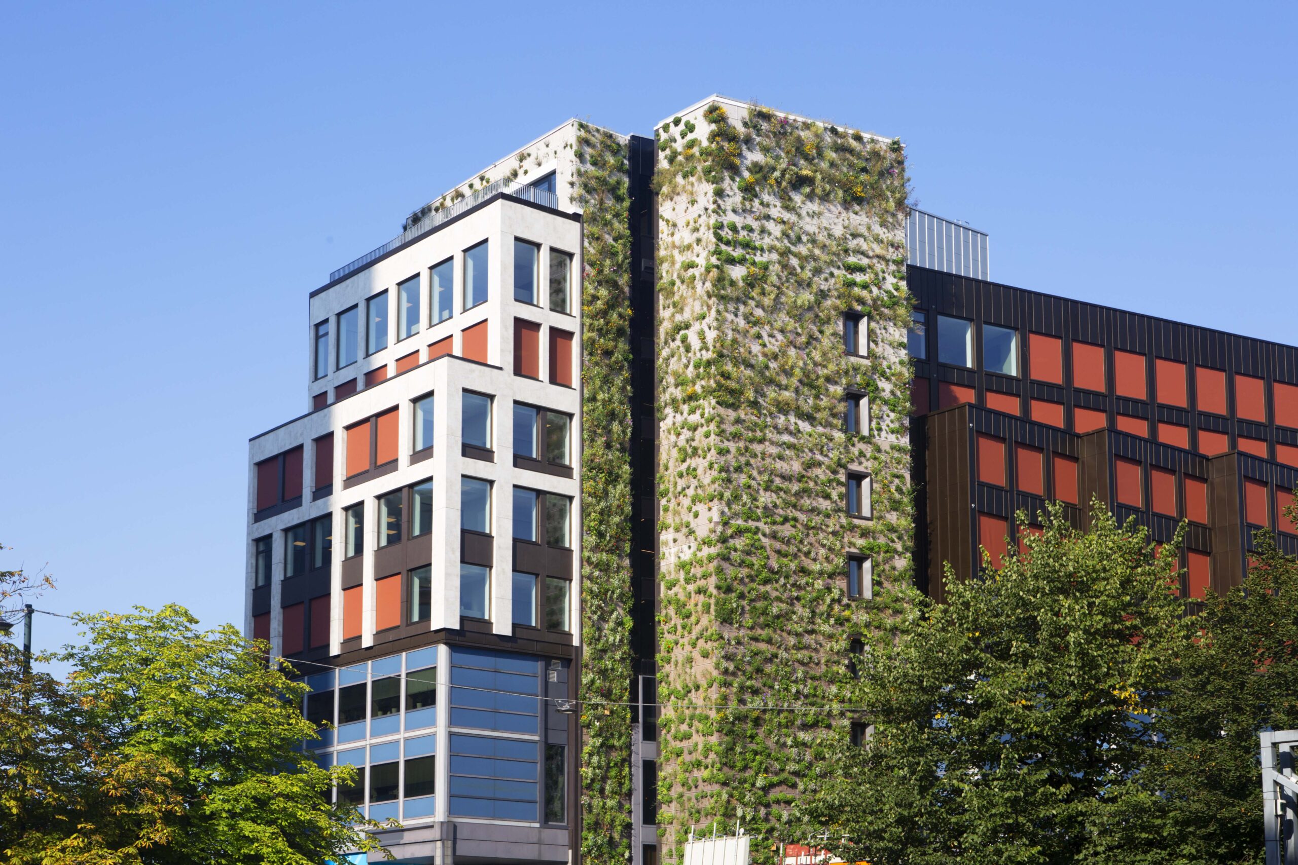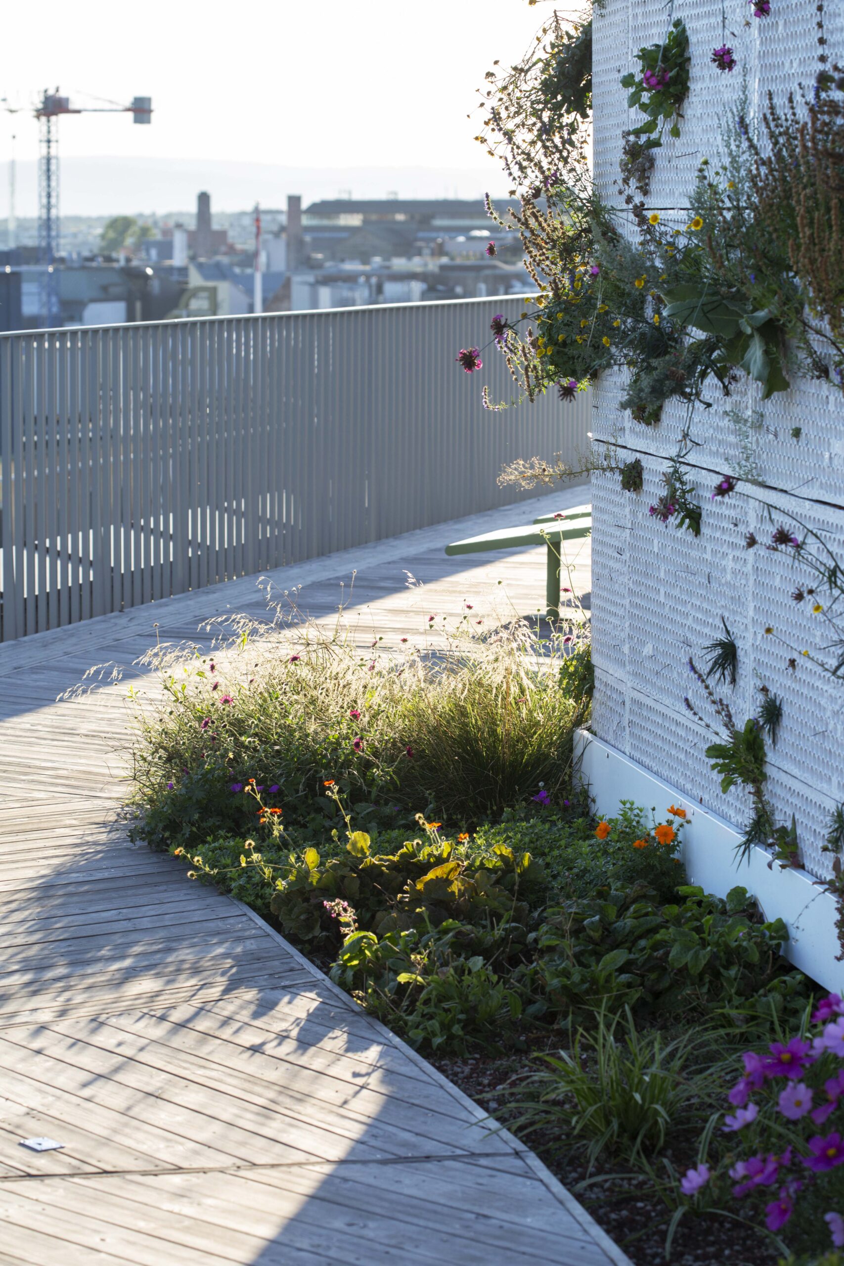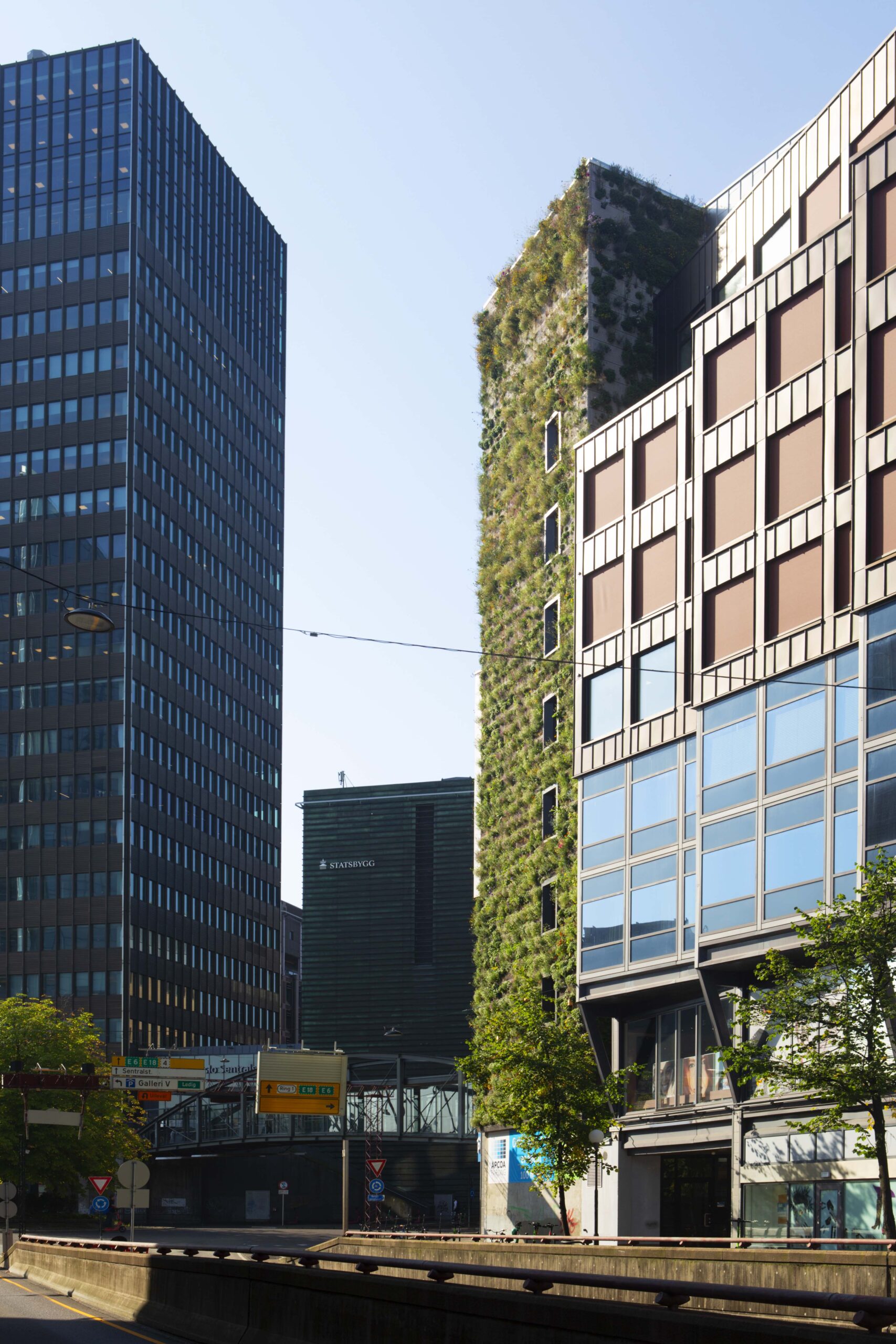 Grønne vegger og tak skaper en urban biotop som gir nytt liv til fasadene, reduserer varmeøyer og forbedrer luftkvaliteten. På takterrassen finnes variert vegetasjon, inspirert av Oslos naturlige landskap – fra skogbryn til fjordlandskap.