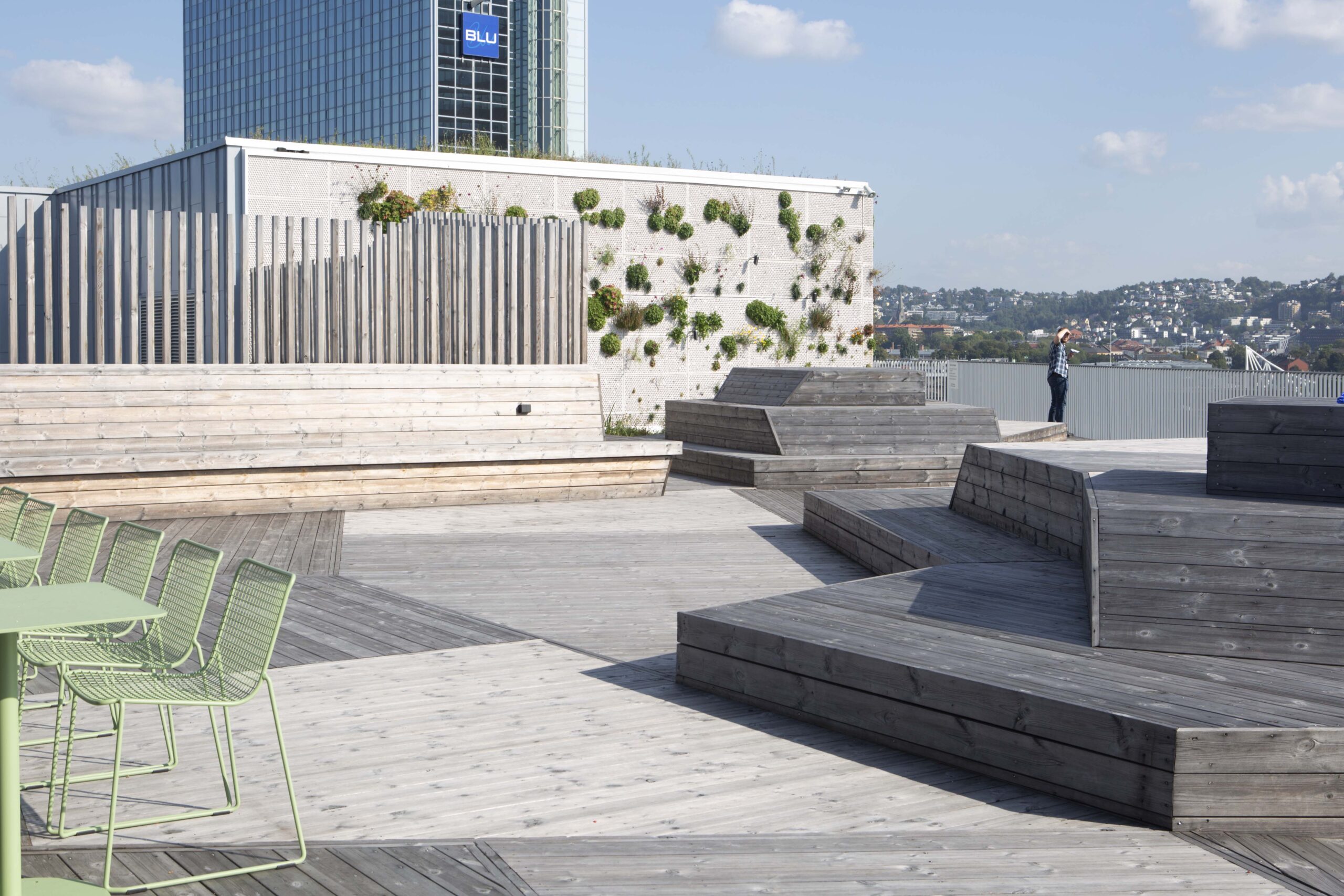 Byggets beliggenhet gjør at det ikke har tradisjonelle utearealer. Swecos landskapsarkitekter har derfor utviklet et innovativt blågrønt konsept hvor naturen integreres direkte på bygget.